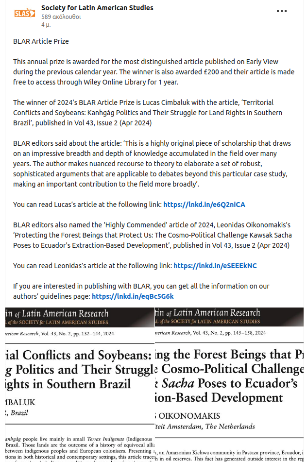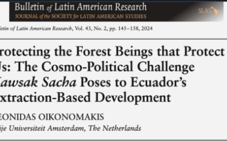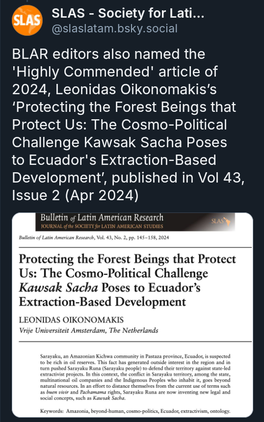 At SLAS 2025 in Bristol, the Society for Latin American Studies (SLAS) and the Bulletin of Latin American Research (BLAR) editors named my article ‘Protecting the Forest Beings that Protect Us: The Cosmo-political Challenge Kawsak Sacha poses to Ecuador’s extraction-based development‘, the Highly Commended Article of 2024.